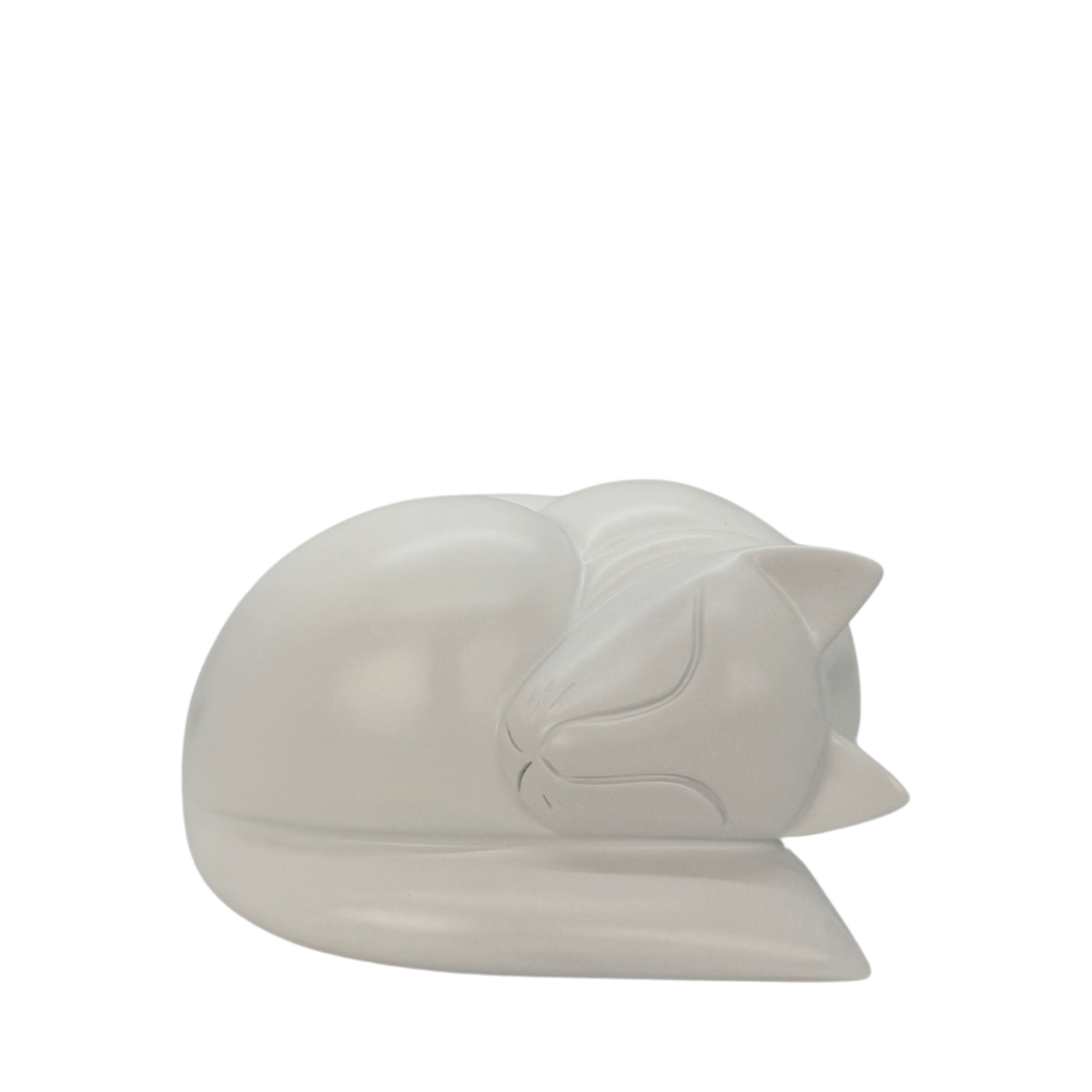| Urna ve tvaru spící kočky ze syntetické pryskyřice. | Urnička jako soška kočky vhodná i na zahrádku. Možnost vložení ostatků více kočiček. | Urna ve tvaru spící kočky ze syntetické pryskyřice bílá. | Keramická urna se sametovým povrchem se zlatými tlapkami pro zvířátka do 10kg. Nápis nelze | Keramická urna se sametovým povrchem se zlatými tlapkami pro zvířátka do 70kg. Nápis nelze |
